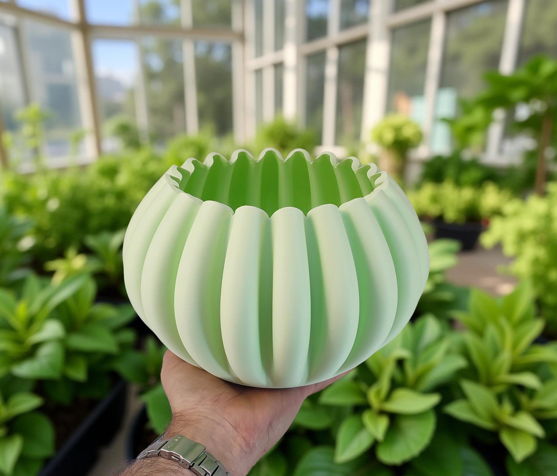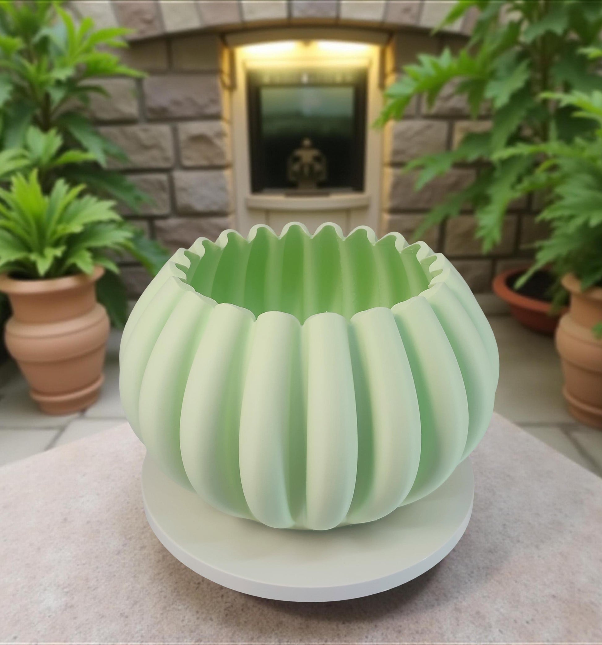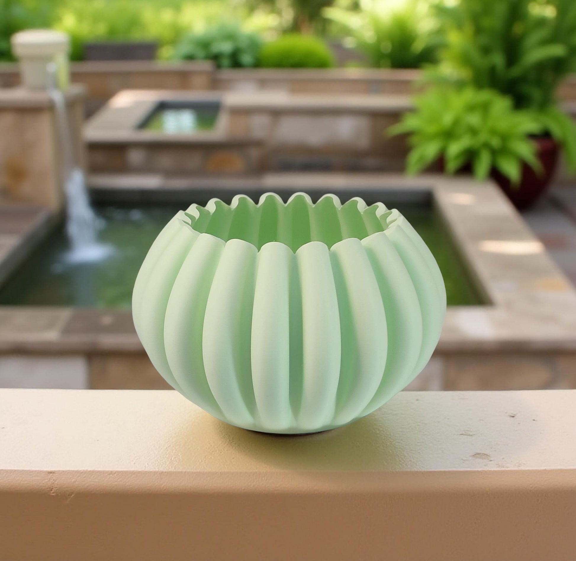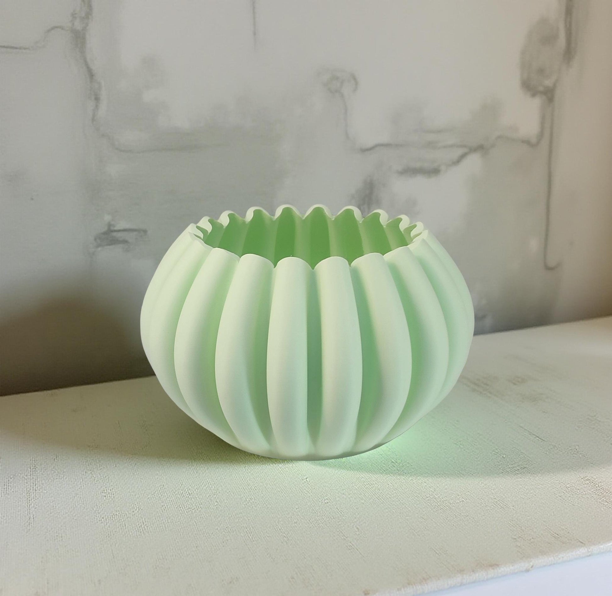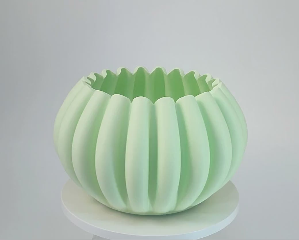 Modern, roomy, pumpkin-shaped vase, light pastel green.